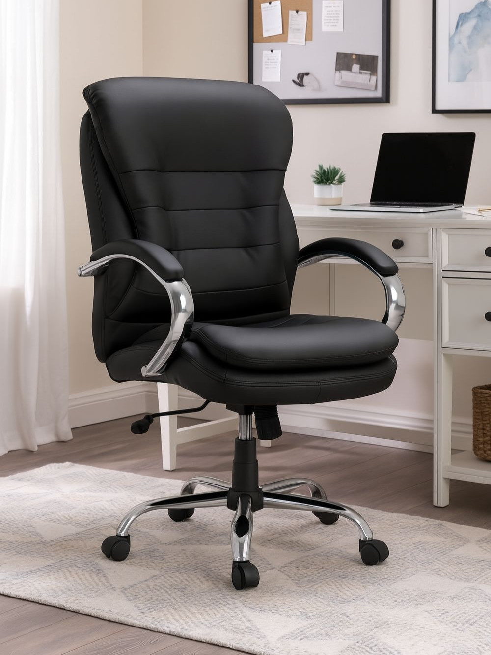 - Upholstered in luxurious black bonded leather